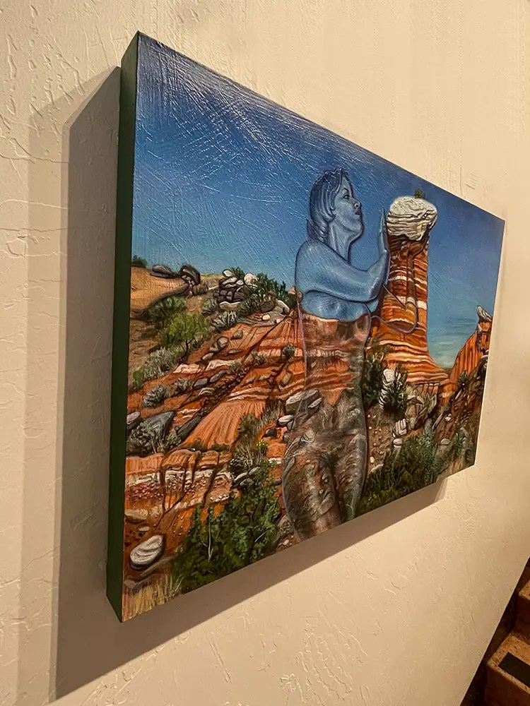 Goddess of Palo Duro represents the nurturing beautiful Mother Earth; her integration with the landscape demonstrates how the female physique is also equally magnificent. This figure-ground inversion of Lauren with the Palo Duro Canyon is a metaphor for humanity’s responsibility to be good citizens of the planet.