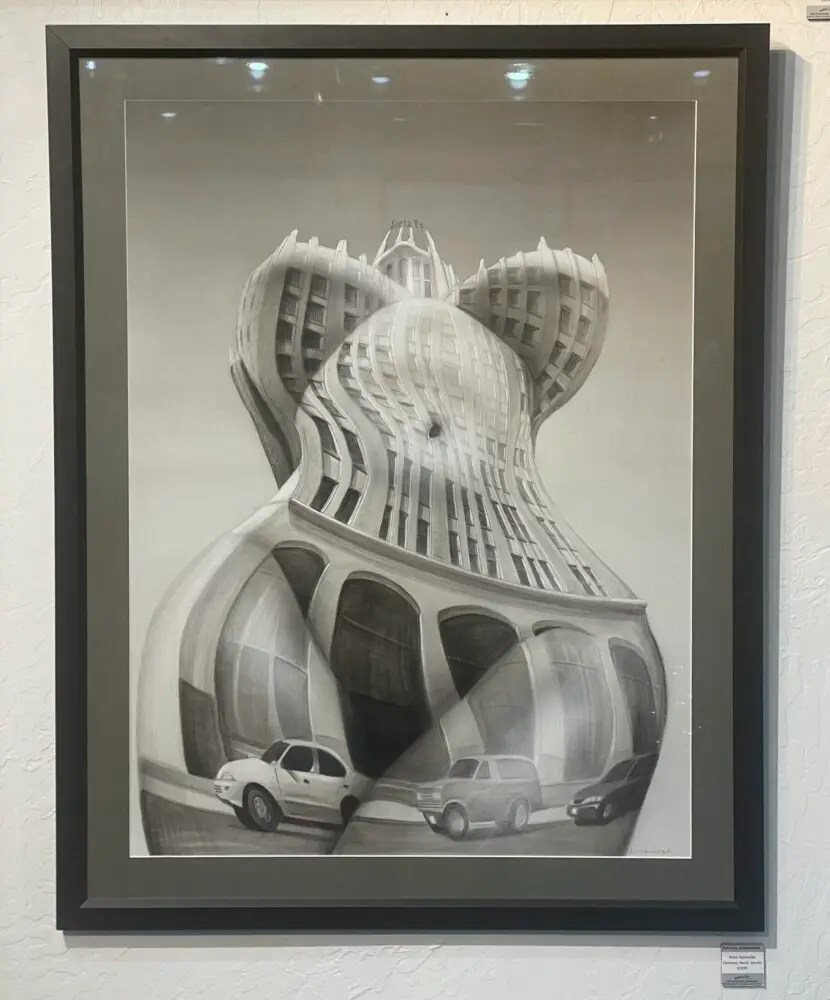 I created Santa Fe Aphrodite to juxtapose the structural perspective with the organic female form. The building’s straight lines merge with the soft curves of feminine anatomy, and the building becomes alive. The interesting viewpoint shows the overlapping of the Neo-Gothic, Santa Fe building construction along with a beautiful winding shape.